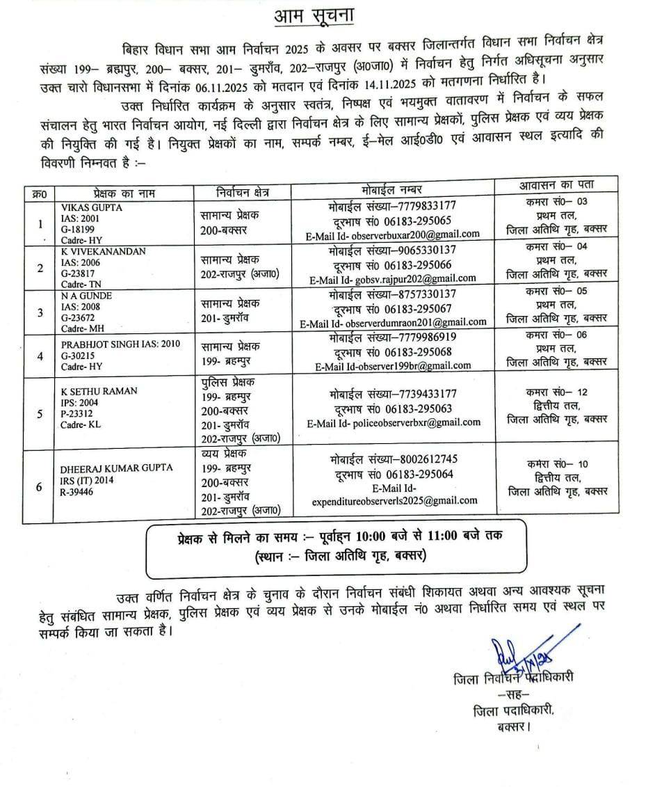 बक्सर जिले के चारों विधानसभा क्षेत्रों में मतदान 6 नवंबर को, मतगणना 14 नवंबर को