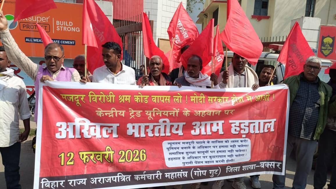 मजदूर विरोधी चार श्रम कोड के खिलाफ केंद्रीय श्रमिक संगठनों द्वारा आहूत अखिल भारतीय आम हड़ताल के समर्थन में बिहार राज्य अराजपत्रित कर्मचारी महासंघ गोप गुट बक्सर के सदस्य ज्योति चौक पर प्रदर्शन किया। गोप गुट के सदस्यों हड़ताल के समर्थन में पुलिस चौकी तक मार्च भी किया।