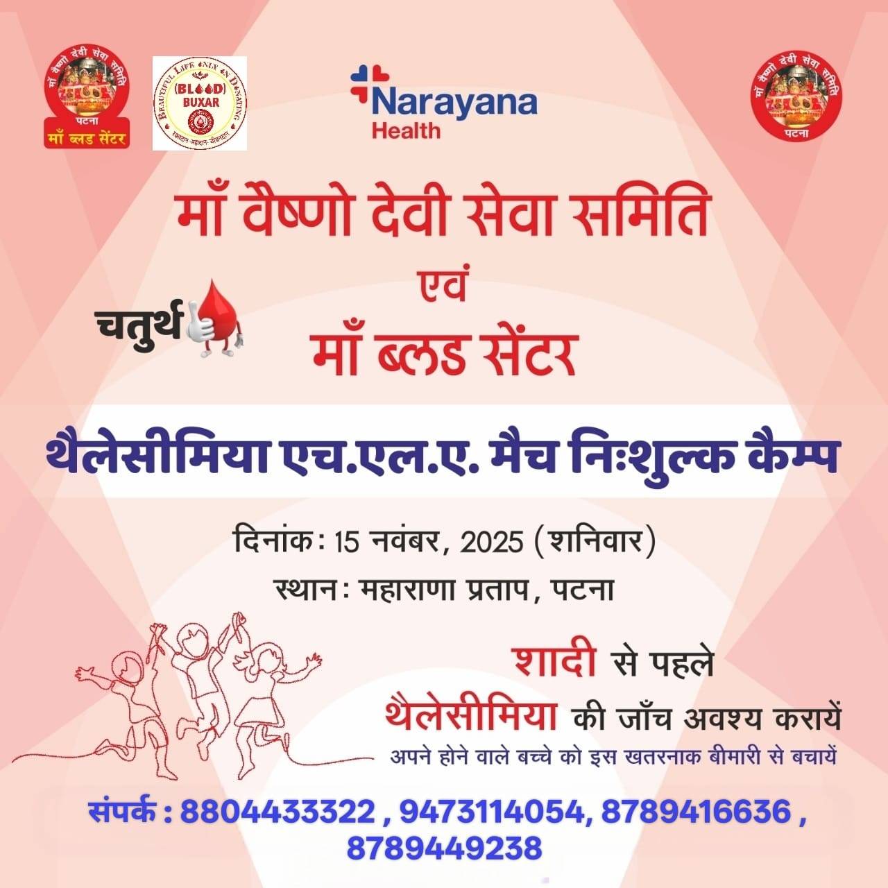 थैलेसीमिया पीड़ित बच्चों को हर 15 दिन में रक्त चढ़ना पड़ता है । बोन मैरो ट्रांसप्लांट कर इसका स्थाई इलाज संभव है । इसके लिए आगामी 15 नवंबर 2025 को चौथी बार मां वैष्णो देवी सेवा समिति और मां ब्लड सेंटर द्वारा महाराणा प्रताप भवन पटना में मुफ्त जांच शिविर का आयोजन किया जा रहा है । यह जानकारी आयोजन समिति तथा ब्लड बक्सर के संस्थापक प्रियेश ने दी कहा कि शिविर में जांच के लिए पूर्व पंजीयन करने वाले ऐसे लोगों की एचएलए मैचिंग जांच की जाएगी। जो अपने सगे भाई या बहन के साथ आएंगे वही जांच करा सकेंगे ।