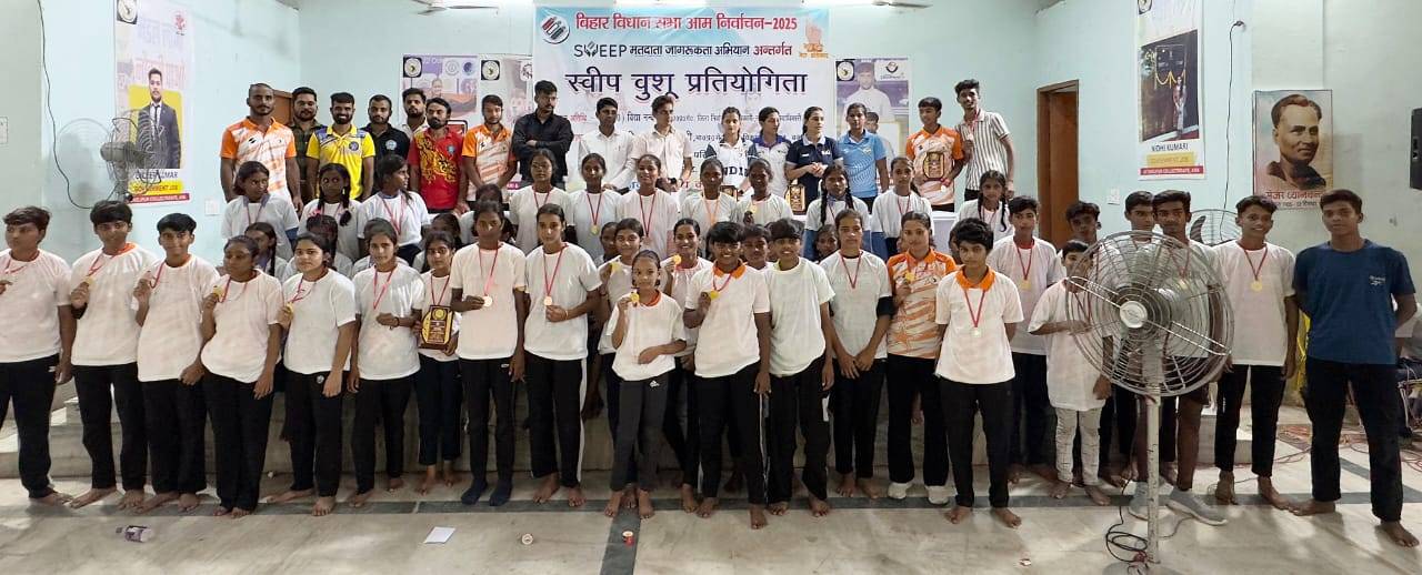 जिलाधिकारी के निर्देशानुसार आसन्न बिहार विधानसभा आम निर्वाचन-2025 के अवसर पर स्वीप (SVEEP) जागरूकता अभियान के अंतर्गत वूशु चैंपियन प्रतियोगिता-2025 का आयोजन रविवार को शहर के कला भवन में किया गया। जिसका शुभारंभ उप विकास आयुक्त आकाश चौधरी तथा अपर समाहर्ता अरुण कुमार सिंह द्वारा संयुक्त रूप से दीप प्रज्वलित कर किया गया।